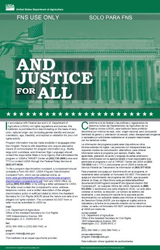 In accordance with federal civil rights law and U.S. Department of Agriculture (USDA) civil rights regulations and policies, this institution is prohibited from discriminating on the basis of race, color, national origin, sex (including gender identity and sexual orientation), disability, age, or reprisal or retaliation for prior civil rights activity.